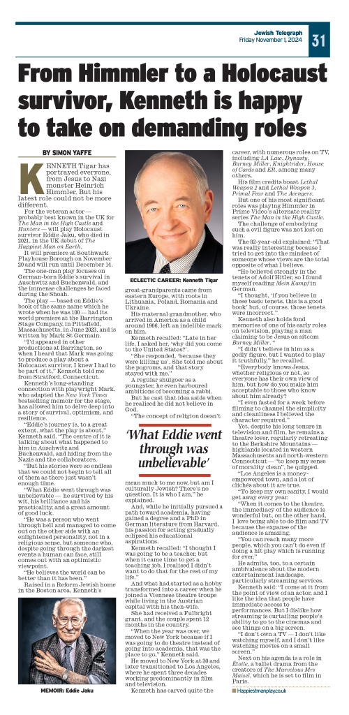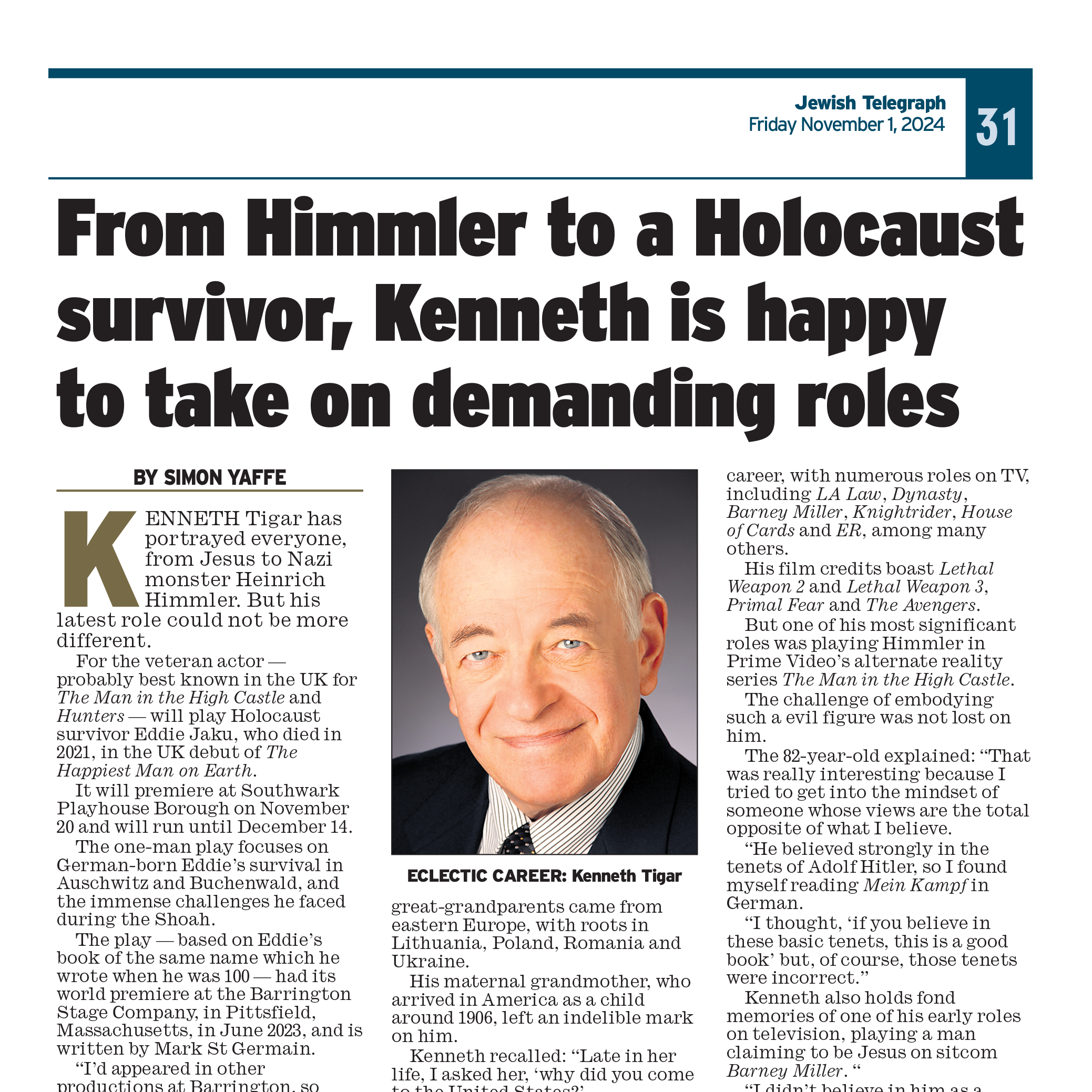From Himmler to a Holocaust survivor, Kenneth is happy to take on demanding roles